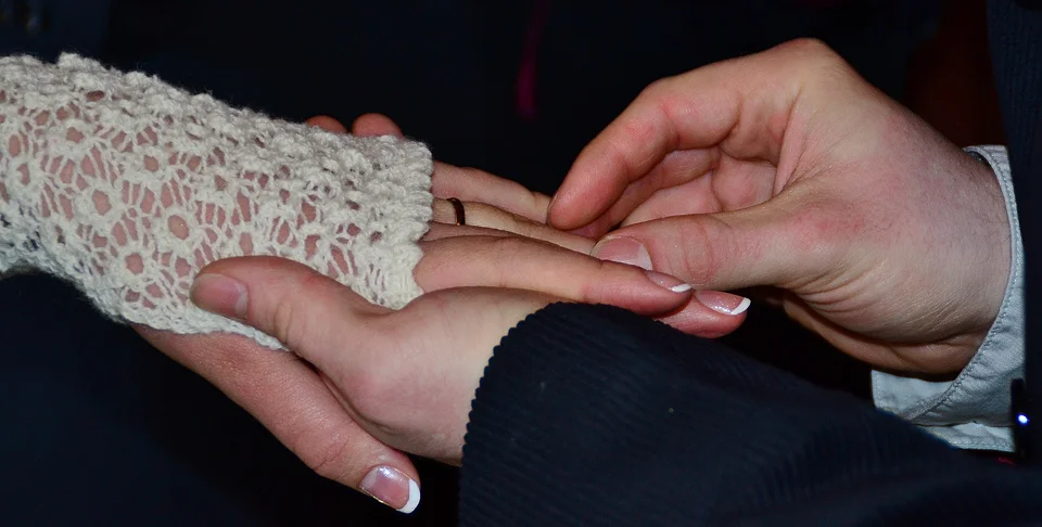 These beautiful wedding shawls, hand-knitted in fine 1-ply Shetland lace wool, are constructed the traditional way using my granny’s method, by first knitting the four borders and then attaching them to a middle section. Very similar to my christening shawls, but with a larger centre, I also use traditional Shetland patterns in these shawls, eg the ‘Tree of Life’, the ‘Cat’s Paw’ and the ‘Bead’, as well as my own interpretations and patterns, so each shawl will be slightly different and therefore unique to you. Although these bespoke shawls weigh less than 200g and can be pulled through a wedding ring (see picture right), they are surprisingly warm.
